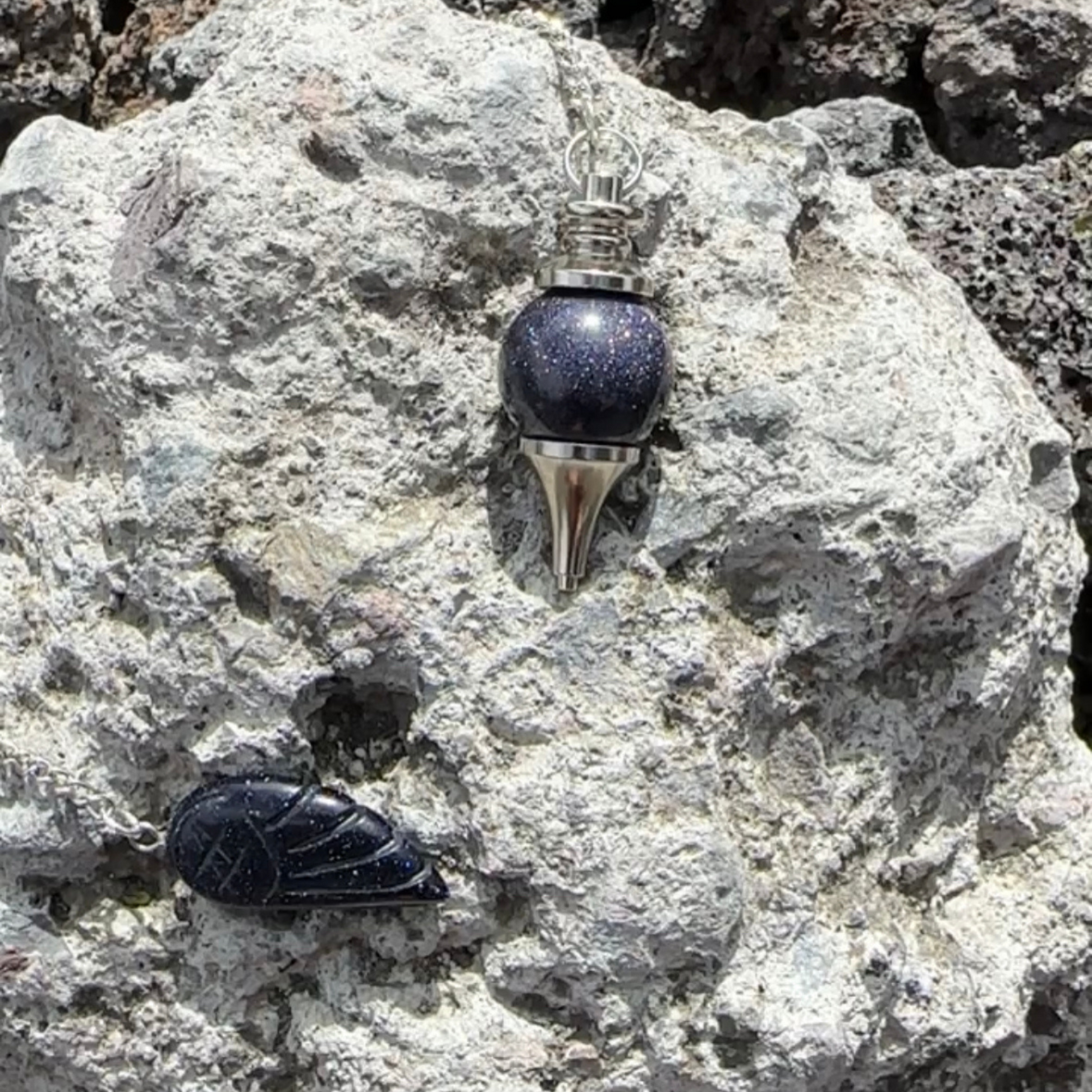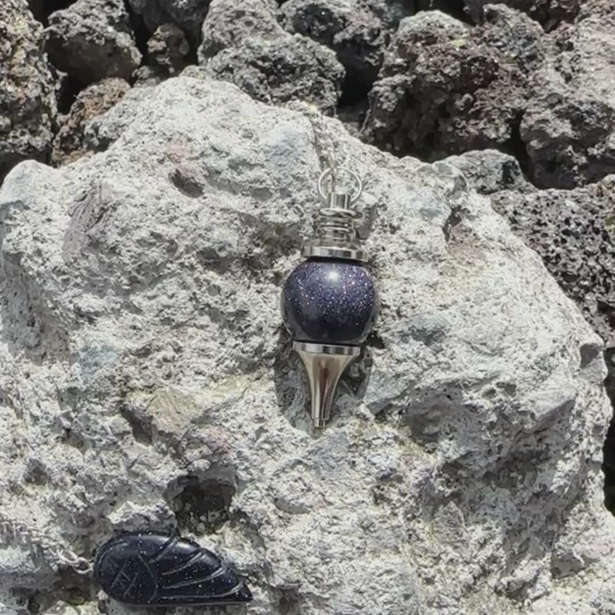 Embrace the enchanting celestial Serenity Blue Goldstone Pendulum, a divination tool that resonates with self-acceptance, creativity, support and grounding. The matching blue goldstone angel wing radiates a celestial aura. This stone is known for its captivating sparkle that instills a sense of calmness. It awakens your creative energies, inspiring you to explore new horizons with confidence. The pendulum’s gentle sway guides you towards intuitive insights, while it’s solid grounding properties provide stability and support.